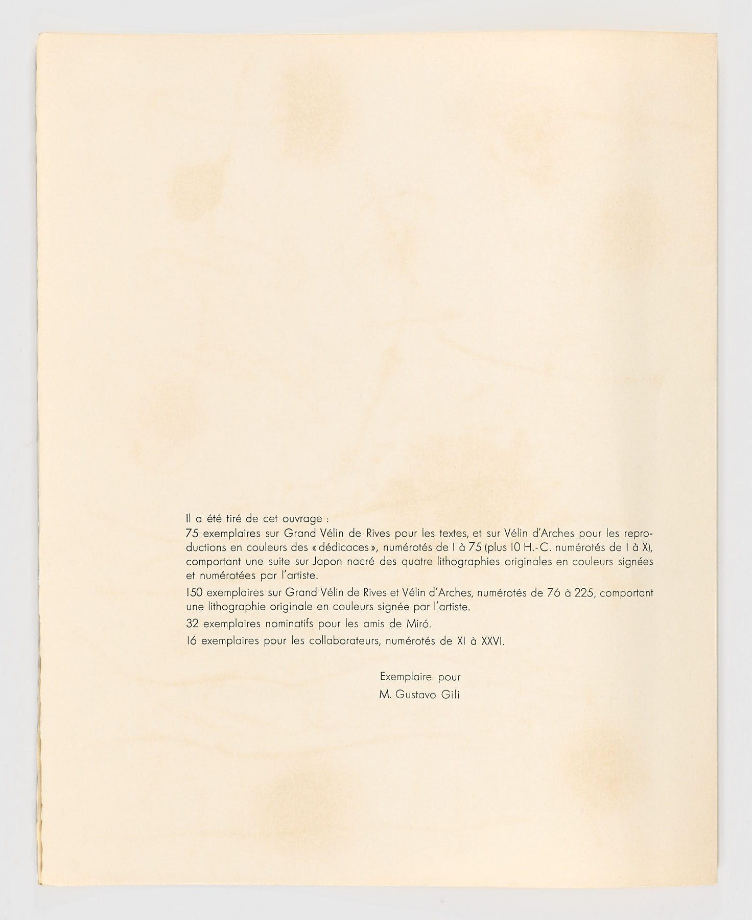 Se encuentra documentada en el catálogo razonado: Cramer, P. (1992). Miró Litógrafo III (1964 – 1969). Maeght Éditeur, p. 50 – 52.